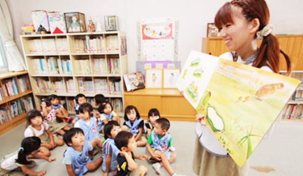 新しい絵本との出会いを作り、たくさんの絵本を見せます。子どもたちは先生の読み聞かせが大好きです。ご家庭への図書貸し出しもしています。