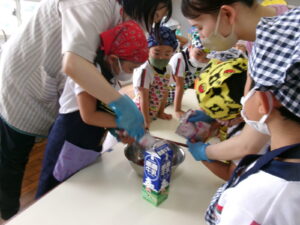 さて、カレーを煮込む間におやつのフルーチェを作ります。フルーチェは作ったことがある子も多く「100回は作ったことあるよ~」という声も(*^-^*) フルーチェマスターがたくさんで心強い!