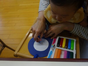 赤ちゃんルームのお友だちはクーピーでぐるぐるお絵描き😄