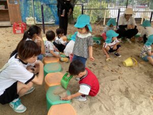 戸外ではお外遊び中のみかん組さんと一緒にお砂場をして楽しみました🍊