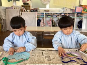 チューリップのバッグにシールを貼って飾りつけをします🍀